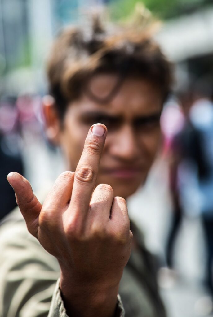 英語圏で、中指を立てる行為は最も有名で、かつ最も下品・挑発的なジェスチャーのひとつ。