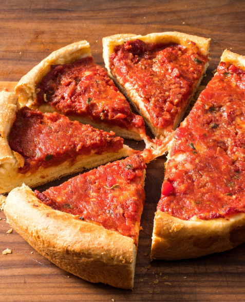 です。違いは色々ありますが、大きな違いは生地の薄さにあります。NYスタイルのピザが薄く折り曲げて食べられるクラストなのに比べ、シカゴスタイルは厚みのあるしっかりをしたパイのようなクラストで、ディープデッシュと呼ばれます。