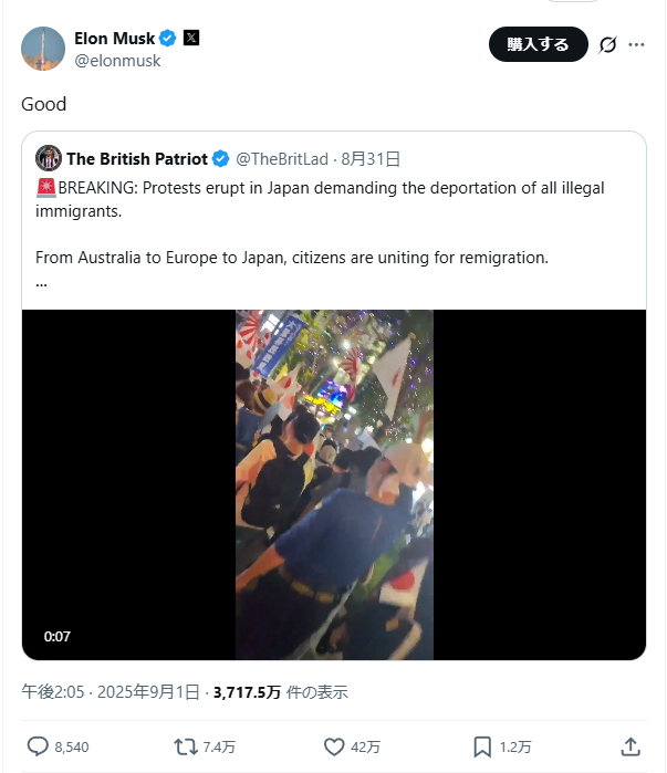 彼は以前も、日本での違法移民デモの投稿に「Good」とだけコメントしており、移民問題への関心がうかがえます。