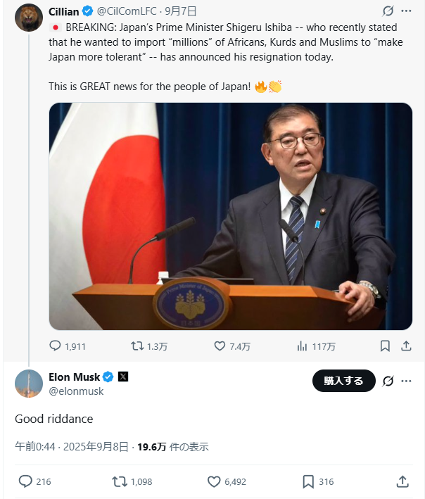 石破首相の辞任ニュースに「Good riddance」とコメントしたマスク氏(笑)