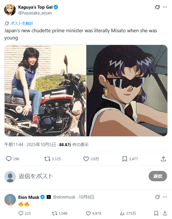 彼はSNSで、高市氏の若い頃の写真をもとにしたポスト(「エヴァンゲリオン」の葛城ミサトに例えた投稿)に対して、ファイアー🔥🔥の絵文字だけで反応。